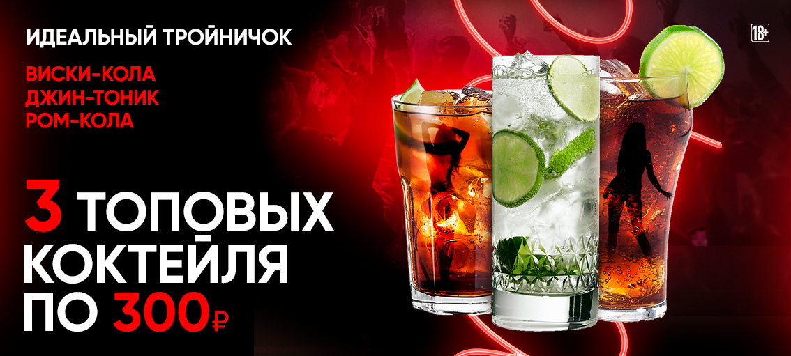Три самых топовых коктейля всего по 300 рублей до 00:00 — каждый день без ограничений! — Виски кола — Джин тоник — Ром кола